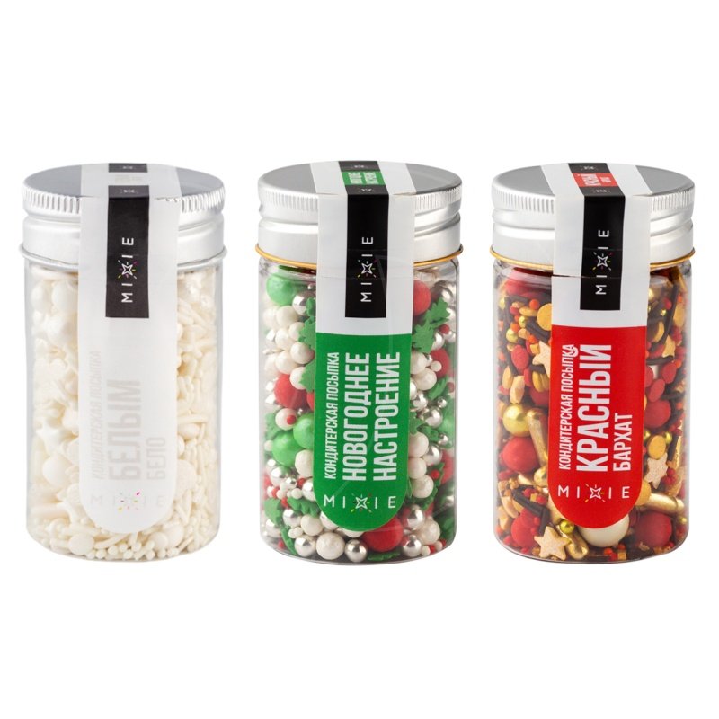 Новогоднее настроение, Красный бархат и Белым-бело - каждая из посыпок порадует вас своими цветами и формами в виде елочек, снежинок, звездочек и шариков.
